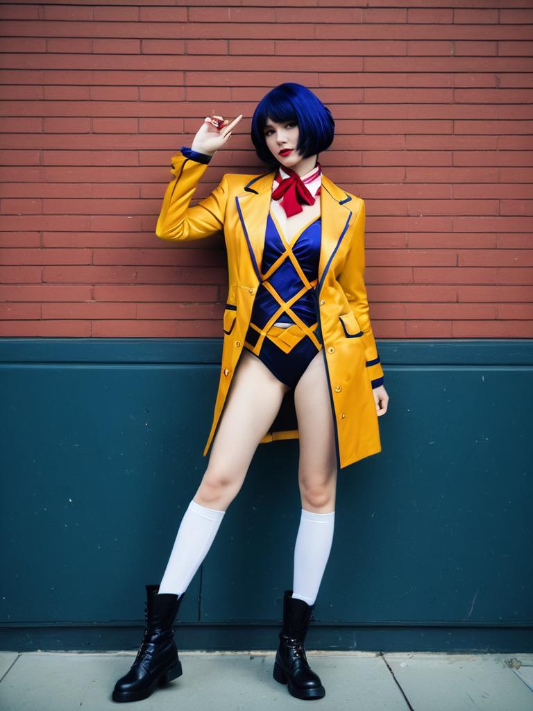 Sexy cosplay woman character wearing Faye Valentine costume. Realistic photo. Jane Doe dressed as Faye Valentine --sref 1388