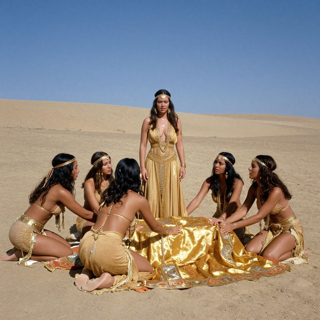 "Warp Drive a film still from a 1970s movie showing a mystical desert tribe of beautiful women performing the golden blanket ritual,"