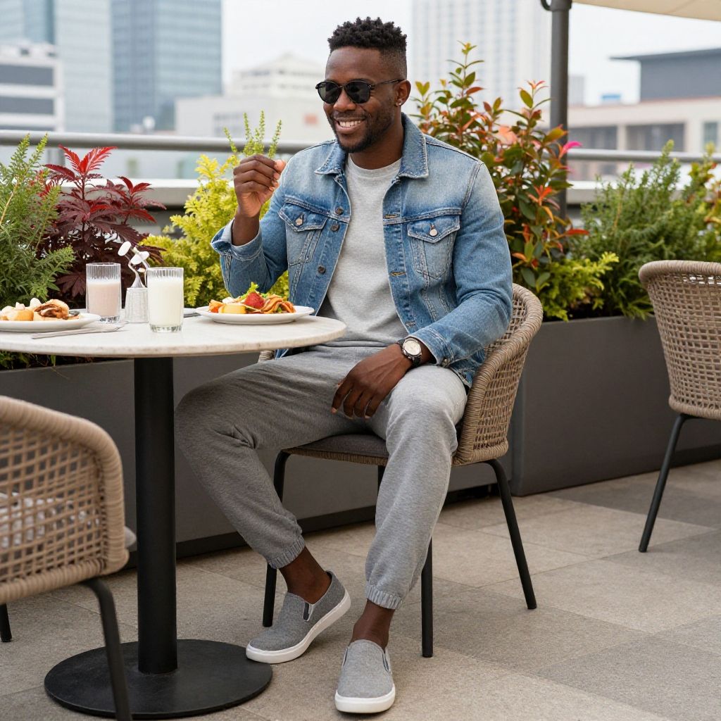 Brunch attire black male, contemporary outfit featuring a fitted denim jacket over a neutral t-shirt, jogger pants, and slip-on shoes, man smiling and enjoying brunch at a rooftop garden cafe, vibrant plants and city skyline behind