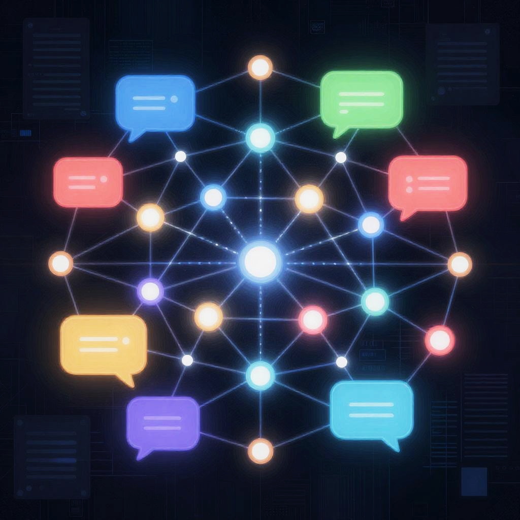Aichat communication network illustrated as a complex web of glowing nodes and chat bubbles interconnected across a dark digital grid, symbolizing AI interactions and data flow, vibrant neon colors with ultra-fine detail painting.