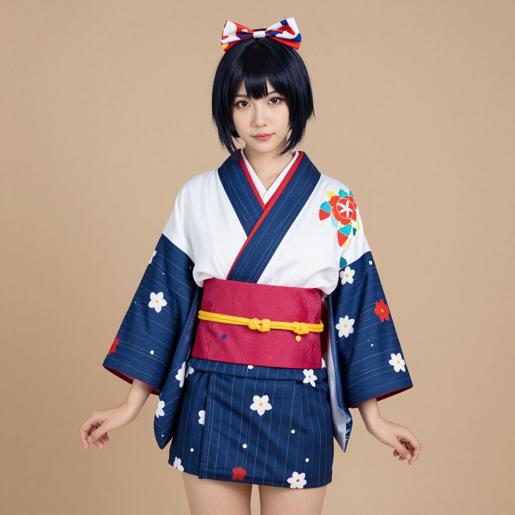 Photograph of an Asian woman with a fair complexion and short black hair, wearing a traditional Japanese yukata. The yukata is navy blue with white floral patterns, and has a white section on the chest and sleeves. She wears a red obi belt with a yellow sash and a large, white and red bow on her head. The background is a plain beige. Her expression is neutral, with a slight smile, and she stands with her arms relaxed at her sides. The image has a clean, bright aesthetic.