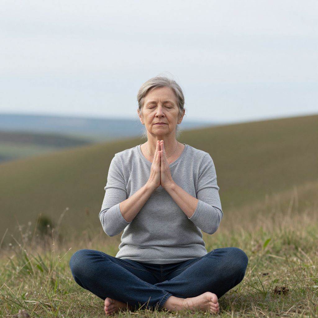 Serenity unfolds as a senior woman sits in quiet meditation on a hillside, her hands pressed together in prayer, embodying the timeless harmony between inner peace and the enduring embrace of nature.