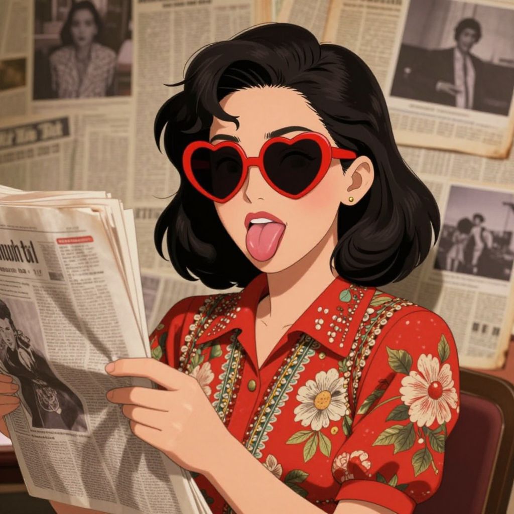 Digital illustration of a young woman with pale skin and black, wavy shoulder-length hair, wearing red heart-shaped sunglasses and a vibrant red floral blouse with gold embroidery. She is sticking out her tongue playfully while holding a newspaper with black-and-white photos and text. The background is filled with more newspapers and black-and-white photos pinned to the wall. Her expression is cheerful and carefree, with a gold earring visible in her left ear. The overall style is reminiscent of 1980s comic art, characterized by bold colors and exaggerated expressions.