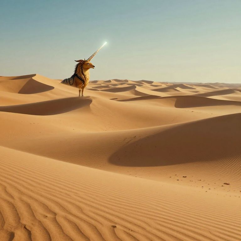 Craft an image in the surrealistic manner of Dali-esque dreamscapes, depicting a whimsical desert panorama where colossal sand hills transform into sinuous waves, mirroring a seascape. In this enchanted realm, a regal mythical creature arises from the dunes' embrace, its shimmering horn reflecting sunlight like a beacon. This vision should instill awe and spellbinding allure while subtly alluding to enigmatic time's progression within this phantasmagoric world.
