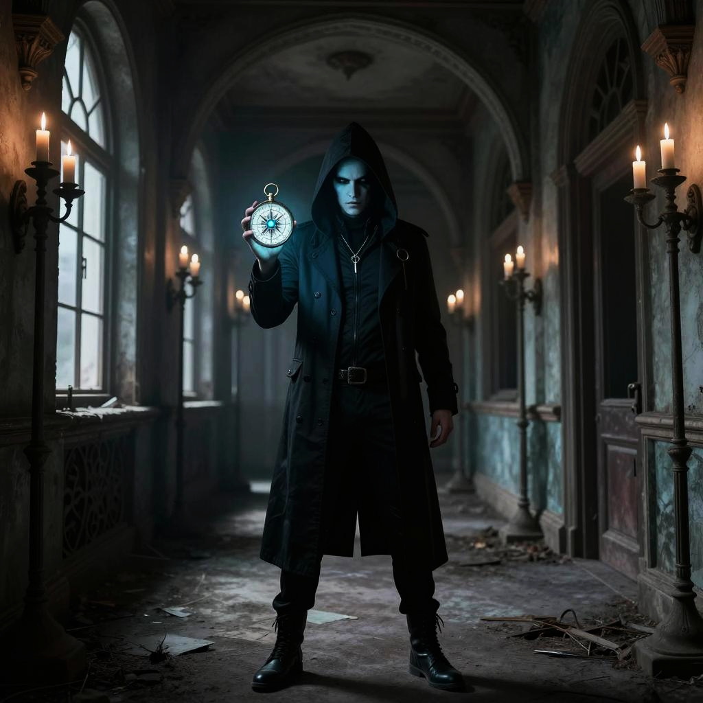 A mysterious man dressed in a sleek, dark outfit stands in a dimly lit, abandoned corridor adorned with tall candle holders and arched windows. He holds a glowing, intricate compass-like device, evoking a sense of an intense, supernatural journey within a gothic or steampunk-inspired setting.