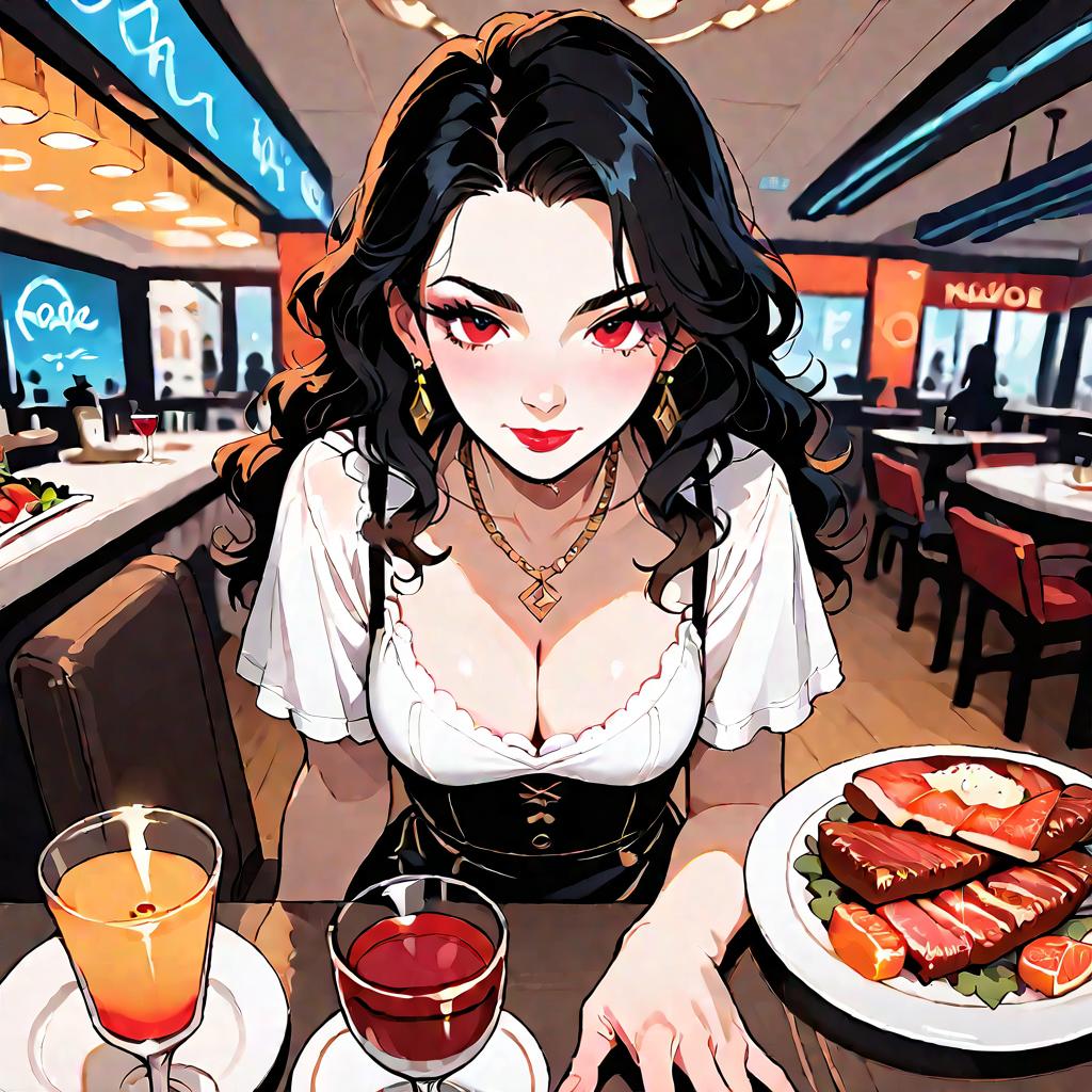 Score_9, score_8_up, score_7_up, source_anime, 1girl, solo, KurumiBase, clock eyes, red eye, yellow eye, heterochromia, black hair, medium breasts, cocktail_dress, wavy hair, necklace, earrings, jewelry, CONCEPT_PovDating_ownwaifu, pov across table, pov dating, food, plate, looking at viewer, drinking glass, cup, phone, table, indoors, sitting, restaurant, wine glass, smartphone, chair, blurry, meat, smile, cleavage, collarbone