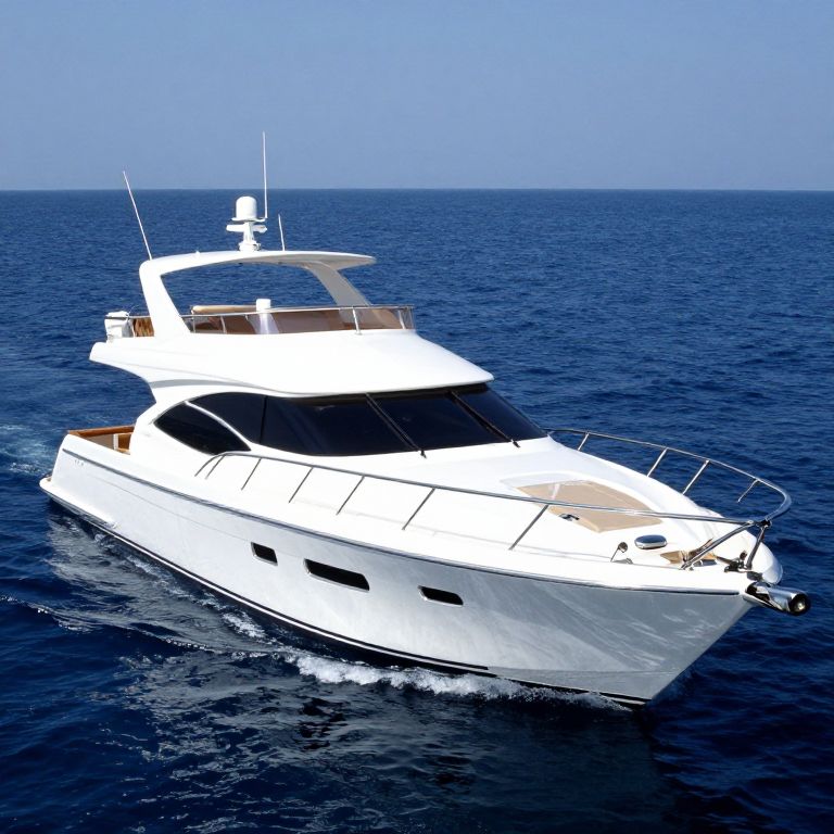 Photograph of a sleek, white luxury yacht sailing on deep blue ocean water. The yacht features a modern design with a two-level deck, dark blue sunshade covers, and a white hull. Antennas and a radar dome are mounted on the upper deck. The yacht is cutting through the water, creating white wake trails behind it. The sky above is clear and bright blue, blending seamlessly with the ocean horizon. The yacht's polished surface reflects sunlight, enhancing its elegant appearance. The image is brightly lit, emphasizing the yacht's pristine condition and the rich blue of the surrounding sea.