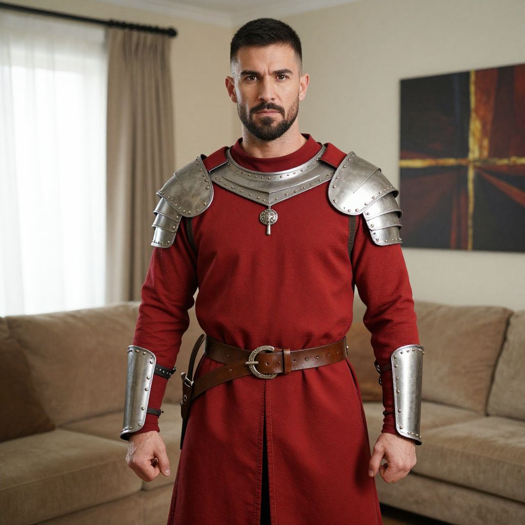 Photograph of a muscular, bearded man with short black hair and a trimmed beard, standing in a living room. He wears a red long-sleeve tunic with a brown leather belt and silver medieval-style armor on his shoulders and forearms. His expression is serious and focused. The background includes a beige couch, a window with white curtains, and a dark abstract painting on the wall. The room is well-lit with natural light. The man's tunic and armor are clean and polished, contrasting with the casual, lived-in appearance of the living room.