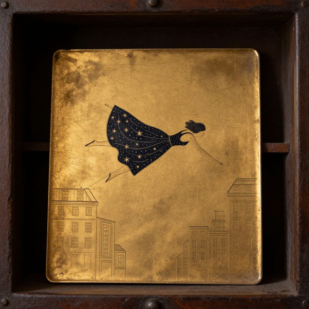 Imagine a dreamlike scene where a woman in a vibrant red dress floats above an urban landscape at night, her attire trailing like a colorful flag caught in a surreal breeze. From a low-angle viewpoint, witness her playful interactions with the illuminated buildings and their inhabitants below, creating a whimsical juxtaposition between her carefree demeanor and the city's chaotic energy. This enchanting tableau invites contemplation on the intricate connection between dreams and reality, much like Chagall's iconic works, evoking a sense of wonderment and melancholy that lingers in the mind long after viewing.