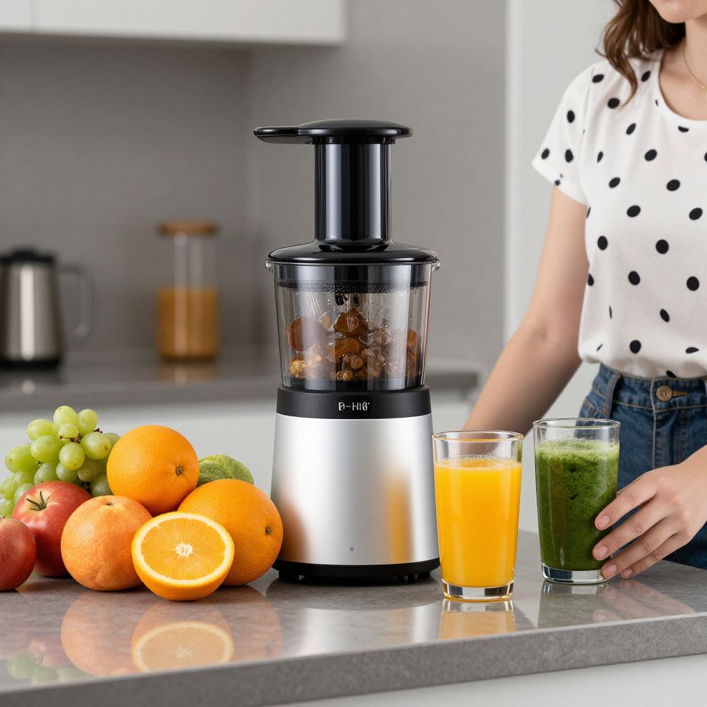 Modern juicer sits prominently on a sleek kitchen countertop, surrounded by vibrant fruits and vegetables, as a woman in a polka-dot shirt stands nearby, showcasing fresh orange juice and green smoothie in clear glasses.