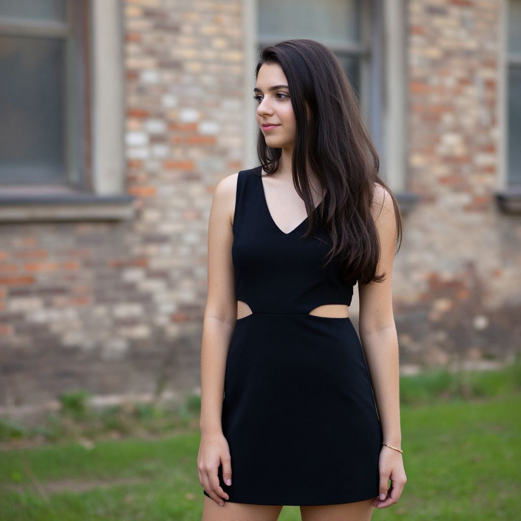 Photograph of a young woman with long, dark brown hair standing on a grassy patch in front of an old, weathered brick building. She's wearing a black, sleeveless, V-neck dress with side cutouts, revealing her waist. She's looking to the left, with a slight smile, and has a gold bracelet on her left wrist. The background is slightly blurred, emphasizing her as the main focus.