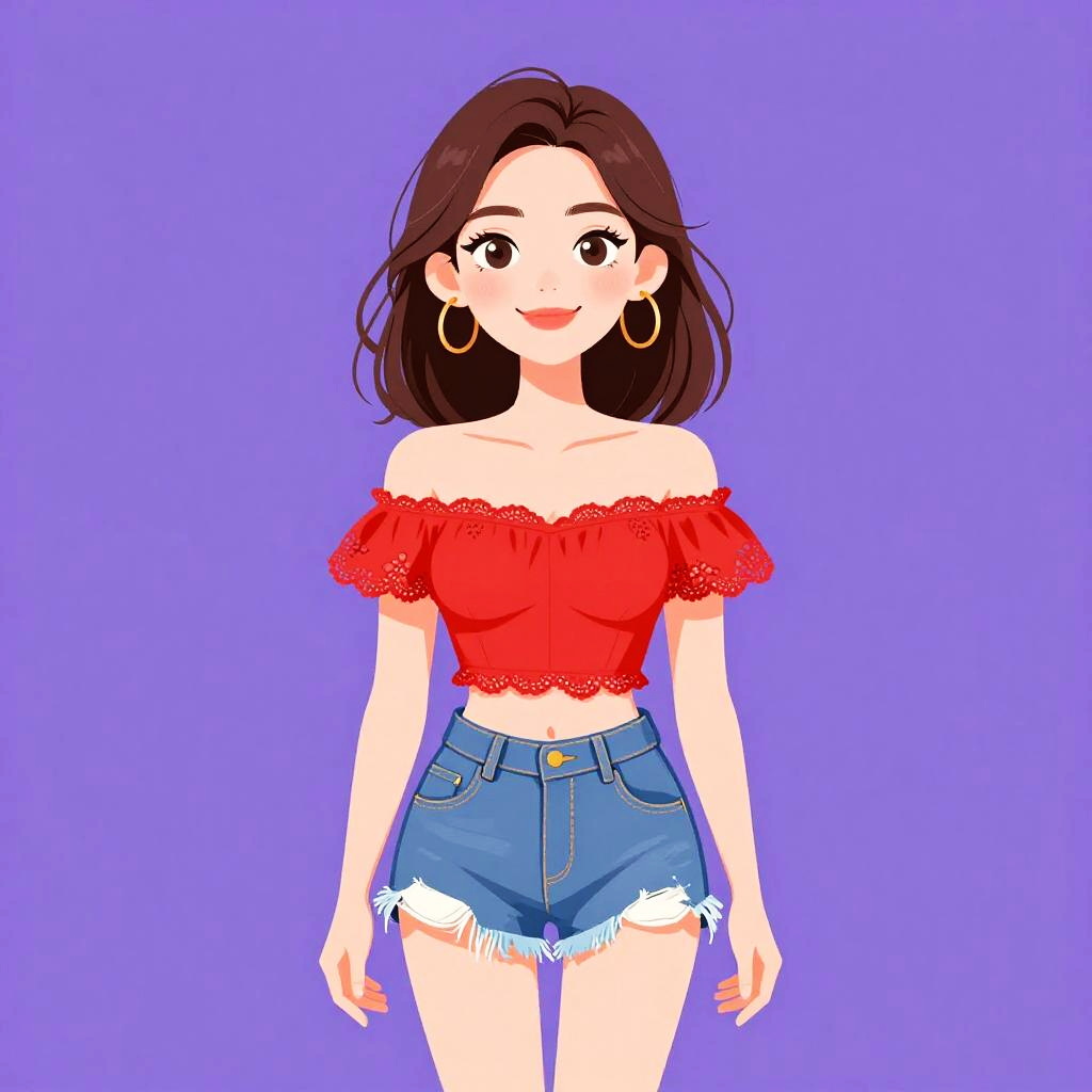 This is a digital illustration of a young woman with long, wavy brown hair and large, expressive brown eyes. She has a light skin tone and is smiling with a slightly open mouth, showing a hint of her teeth. She wears a bright orange, lace-trimmed halter top that highlights her medium-sized breasts, and high-waisted, blue denim shorts with white frayed edges. She accessorizes with large gold hoop earrings, several colorful bracelets on her right wrist, and a small yellow button on her shorts. The background is a solid lavender color with a white border, giving the illustration a clean and modern look. The style is vibrant and cartoonish, with bold lines and bright colors.
