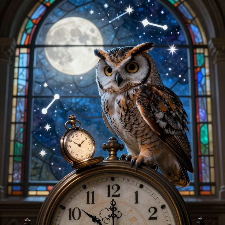 A captivating digital artwork portrays an astute wise owl resting atop an antique timepiece, contemplatively observing a radiant, enigmatic pocket watch. The scene is bathed in the soft glow of moonlight streaming through a stained-glass window adorned with a celestial depiction featuring floating constellations and sparkling shooting stars. This juxtaposition of temporal elements and dreamlike components instills a sense of wistfulness and awe, as if the owl harbors the key to unraveling the enigmas of time itself.