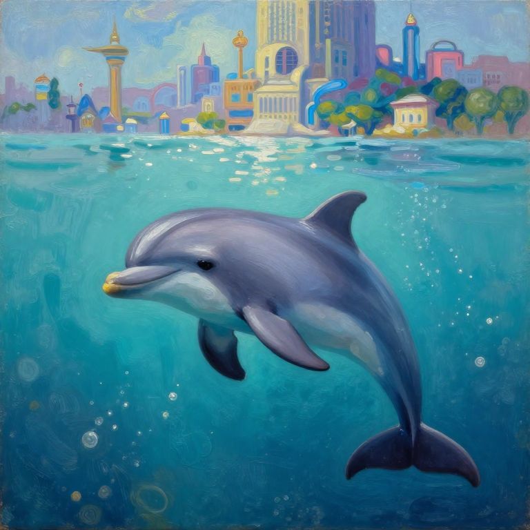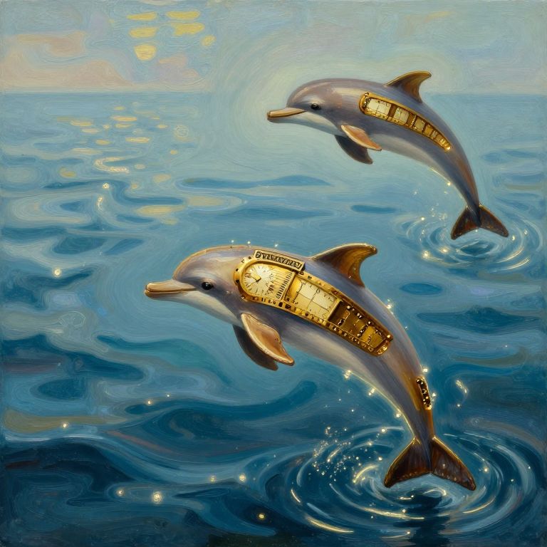 Clockwork dolphins leap from oil paintings, swimming through glowing patterns of time that ripple in non-sequential waves.