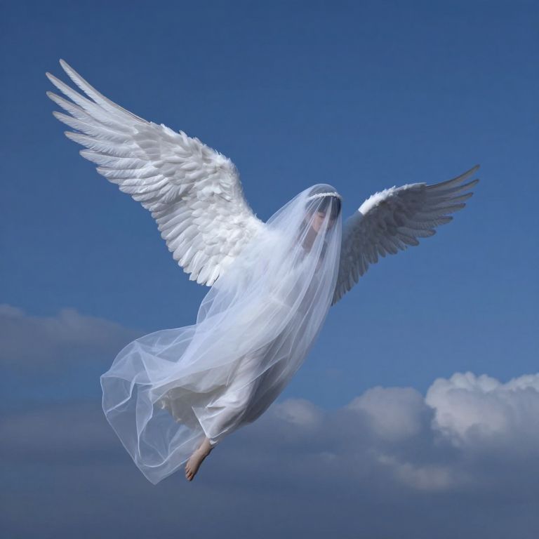 An androgynous figure with flowing white wings and a white veil, soaring in a gale blue sky with clouds, evoking a sense of evening or dusk.