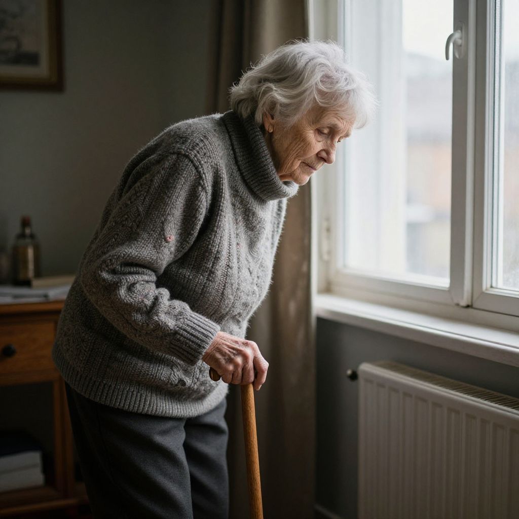 A fragile old woman leaning on a sturdy cane, illustrating dependence, standing by a window with soft morning light, cozy and warm indoor setting, rich textures of knitted clothes and wooden furniture, capturing vulnerability and quiet strength.
