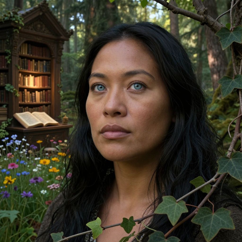 A photorealistic portrait depicts a Pacific Islander woman with captivating ice-blue eyes and delicate features, enveloped in an air of serenity and mystery. Her gaze, lost in thought, drifts towards the distance, framed by an intricate web of ivy. The background seamlessly blends a tranquil Scandinavian forest with an ancient library, where illuminated manuscripts coexist with vibrant wildflowers under dappled sunlight, creating an emotional gradient that evokes both wisdom and curiosity.
