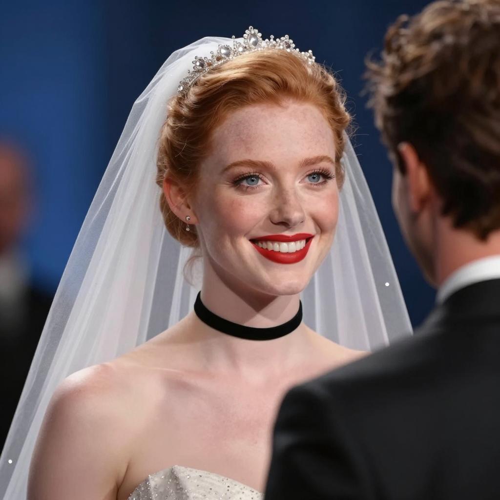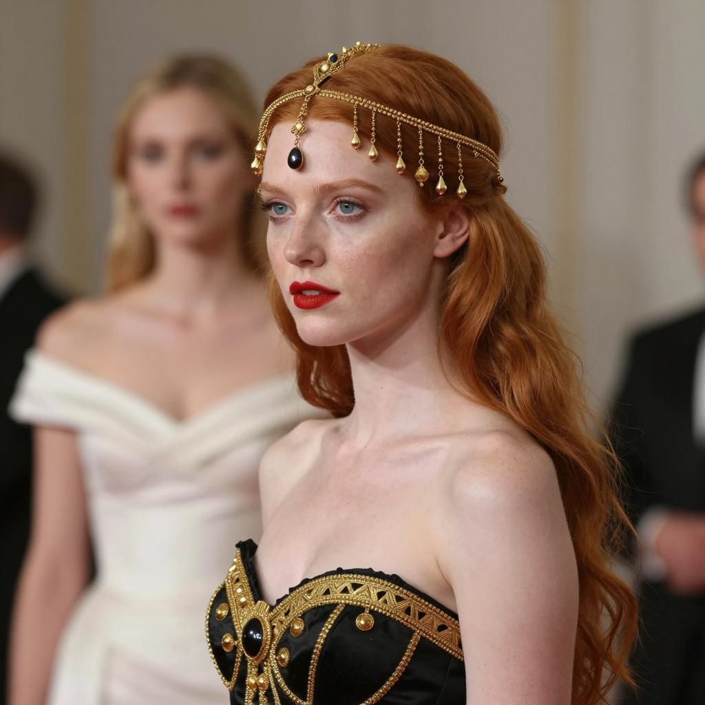 Photograph of a pale-skinned woman with red hair wearing a black and gold ornate dress and a golden headpiece with dangling beads. She has red lipstick and blue eyes, looking slightly to the side. In the blurred background, a blonde woman in a white off-shoulder dress stands, slightly out of focus. Both women are indoors, with soft, warm lighting. The golden headpiece contrasts with the woman's fair skin and red hair. The background includes indistinct shapes and colors, adding depth.