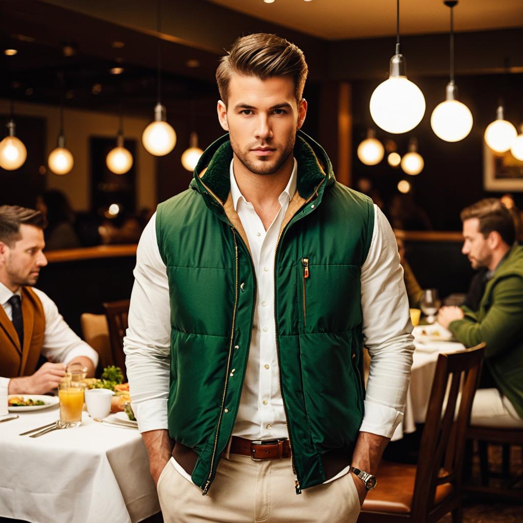 Portrait of a handsome man with brown hair wearing a green vest over a white shirt, a red Christmas-themed tie, and tan pants. He stands confidently in front of a red background decorated with Christmas trees adorned with red, white, and gold ornaments, as well as wrapped gold gifts with red ribbons. The setting features warm studio lighting emphasizing the festive holiday theme.
