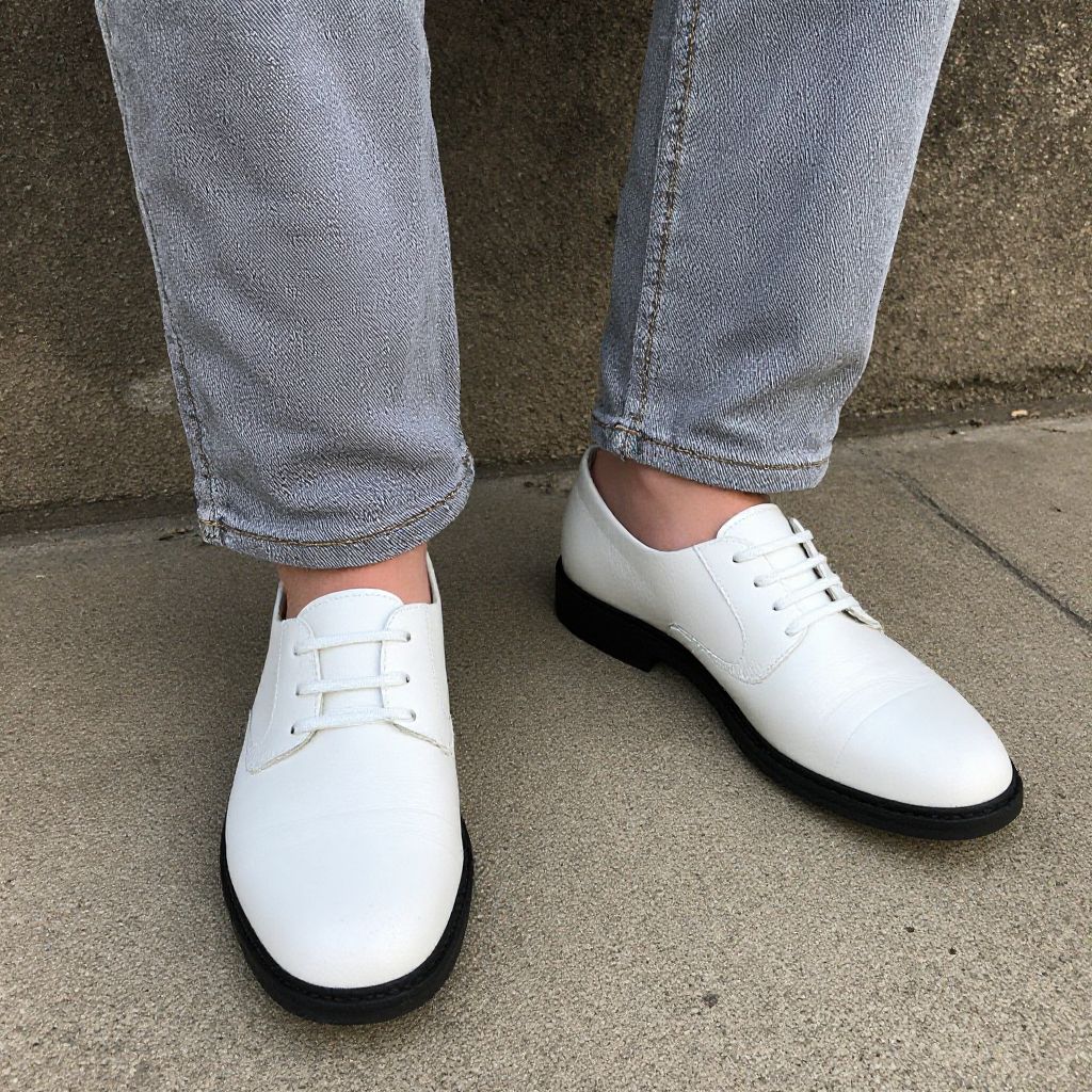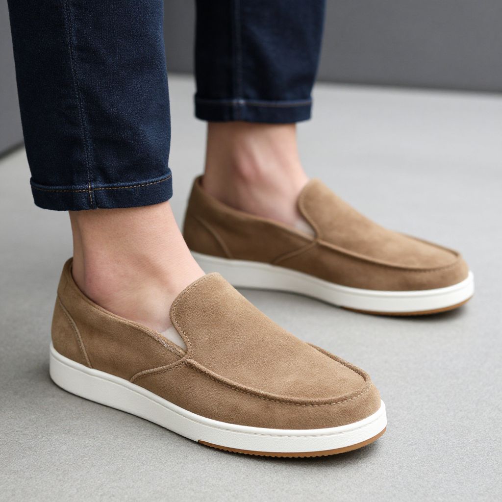 Photograph of a person's feet wearing brown suede slip-on shoes with white soles, paired with dark blue jeans, standing on a gray surface.