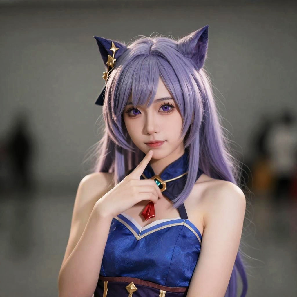 Keqing Wig, woman in a blue dress and gold crown posing for a picture