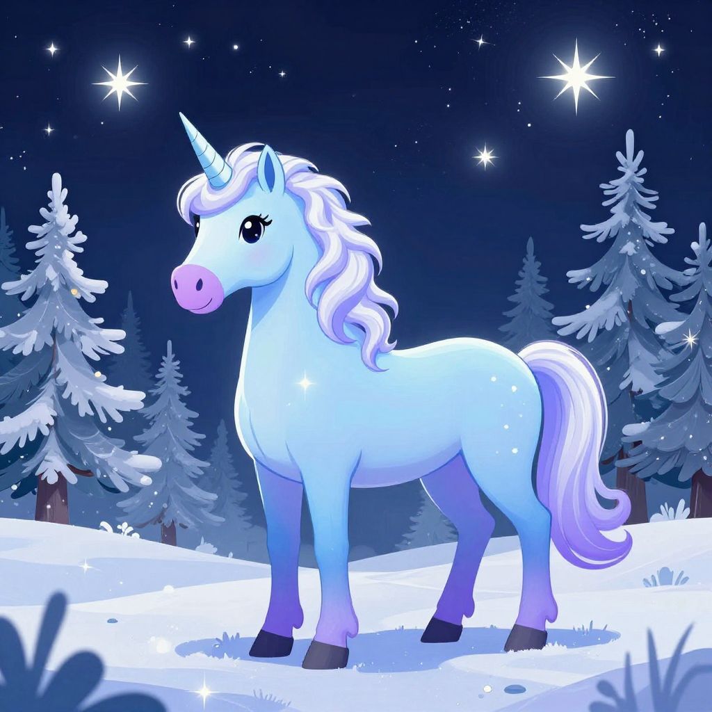 Digital illustration of a cute, white unicorn with a pink nose and a flowing, light purple mane and tail, standing in a snowy forest at night. The unicorn has large, expressive black eyes and a single horn on its forehead. The background features snow-covered pine trees under a starry, dark blue night sky with glowing stars. The unicorn's light blue body contrasts with the dark background, and small snowflakes are visible on its coat. The image has a whimsical, cartoon-like style with vibrant colors and smooth textures.