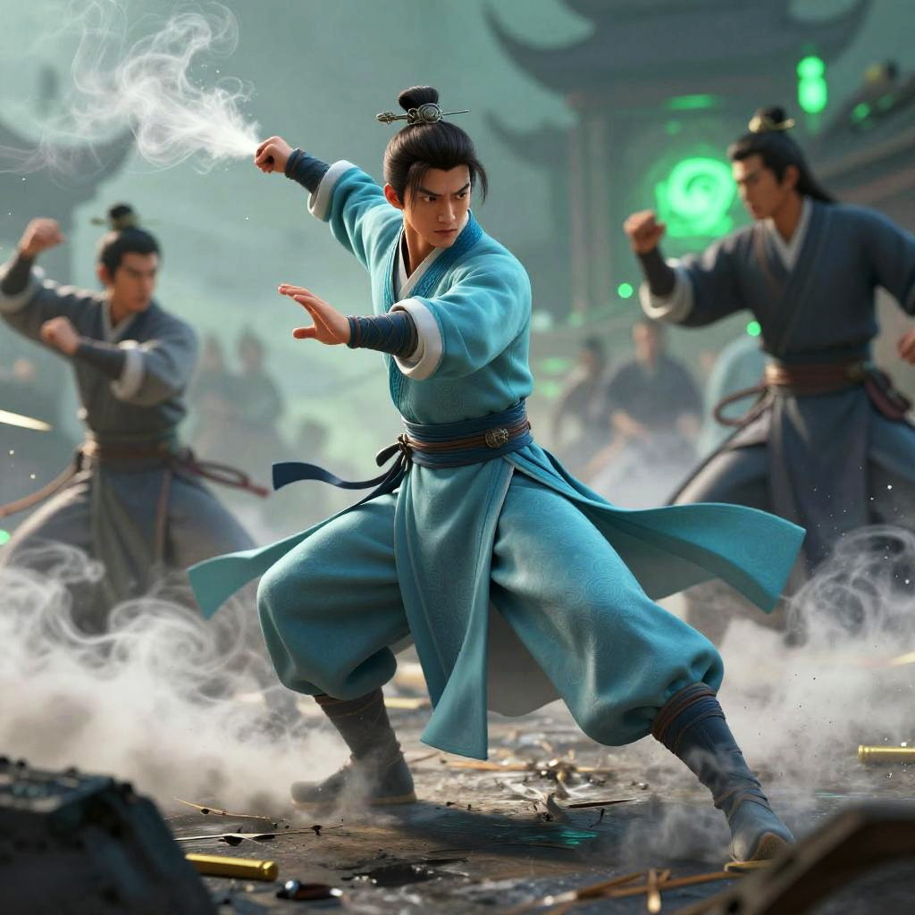 Photorealistic CGI of a blue-robed martial artist with a topknot, glowing fist, surrounded by smoke, in a traditional East Asian setting