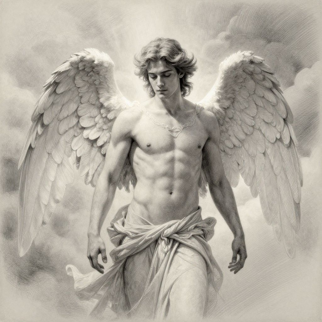 Realistic male angel drawing, detailed human figure with ethereal wings, soft glowing light surrounding him, intricate feather texture, serene expression, dramatic shadows, heavenly background with clouds and gentle rays of sunlight, sketch style with fine pencil strokes.