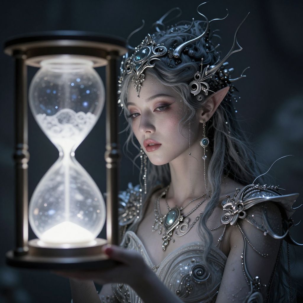 Digital fantasy artwork of a silver-haired, elf-like woman with intricate jewelry and crown, holding a glowing hourglass, in a dark, mystical setting.