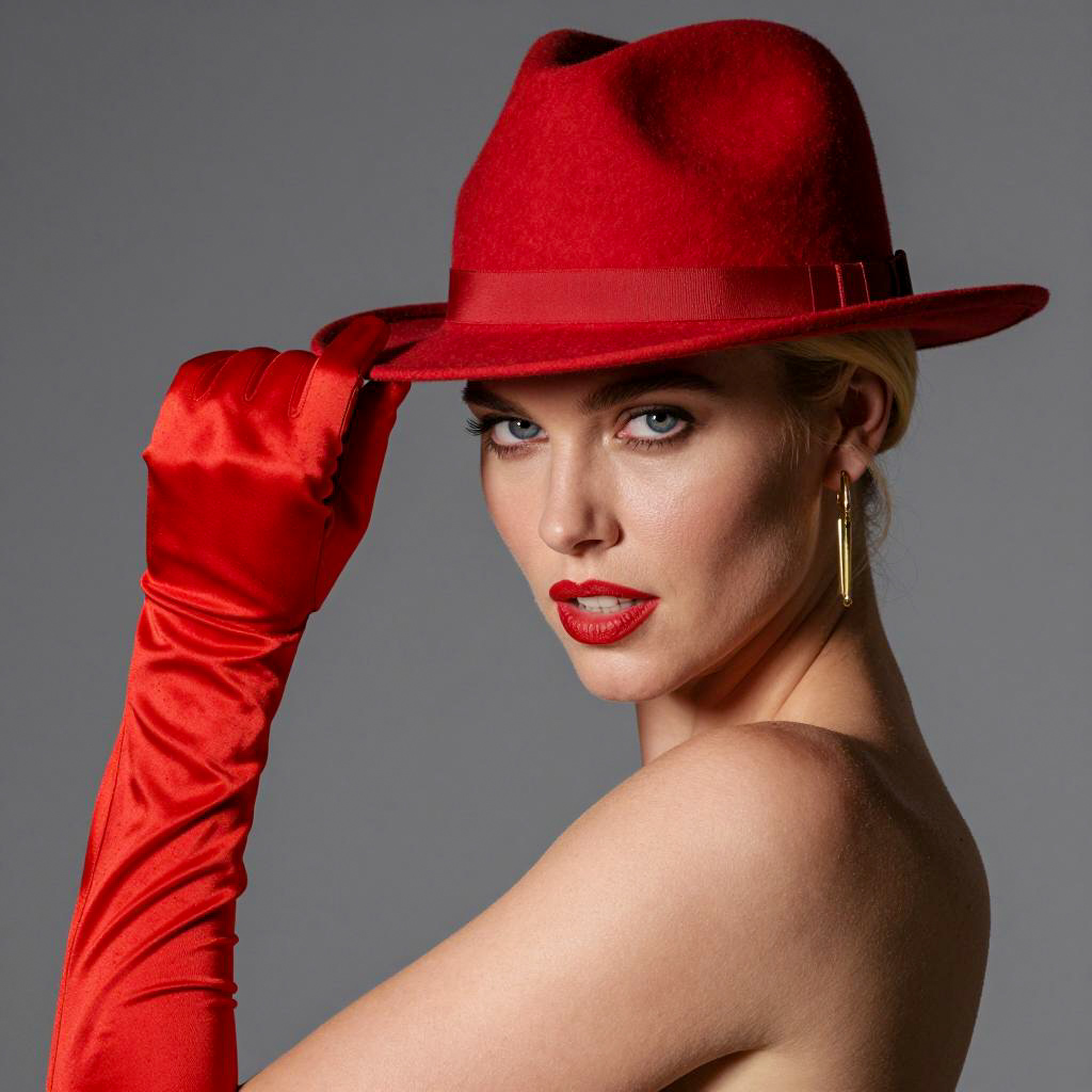 Photograph of a woman with light skin, dark brown wavy hair, wearing a red wide-brimmed hat, red sequined strapless top, and long red leather gloves. She has full red lips, closed eyes, and a hand near her mouth. White background. Intense, glamorous style. Upper body visible.