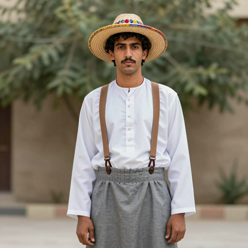 Cholo theme party costume, photorealistic portrait, young Middle Eastern man, wearing traditional clothing, straw hat with colorful embroidery, white billowy shirt, gray apron, brown suspenders, red cord necklace, dark curly hair, mustache, serious expression, blurred green foliage background, natural light, daytime, detailed ures, realistic, full body shot, standing, outdoor setting, focused on face, traditional attire