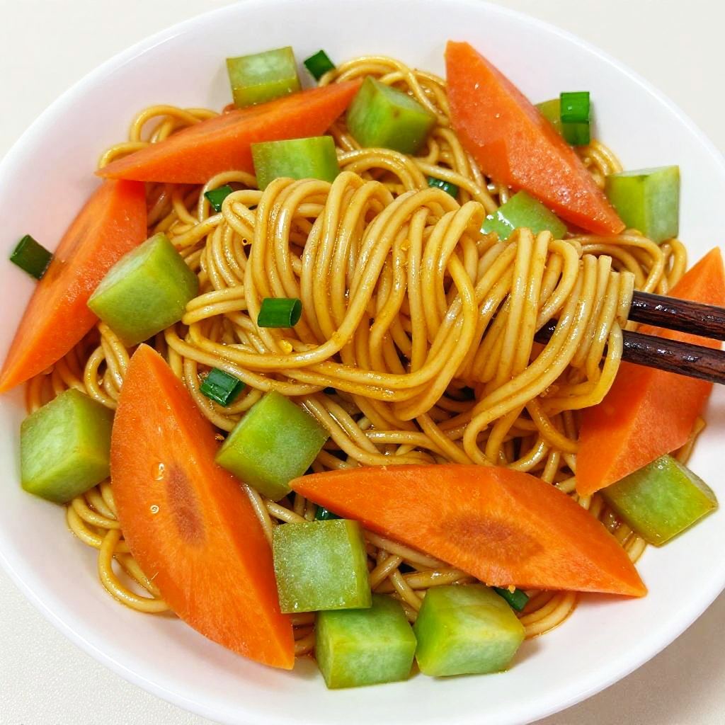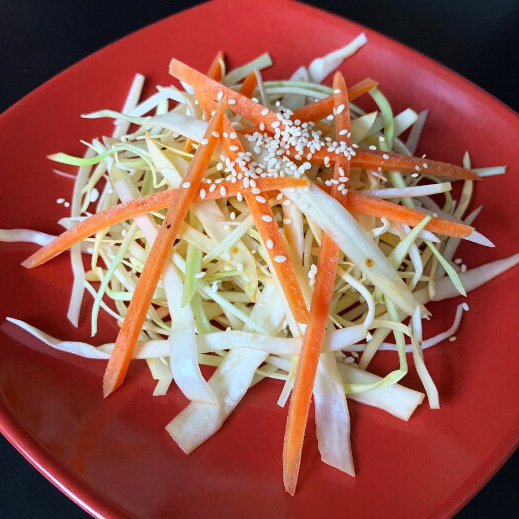 This is a close-up photograph of a colorful salad on a square, red plate. The salad includes shredded white cabbage, thin orange carrots, and white sesame seeds. The bright red plate contrasts with the vibrant colors of the salad. The ingredients are mixed together, creating a textured and visually appealing dish. The lighting highlights the freshness and crispness of the vegetables.