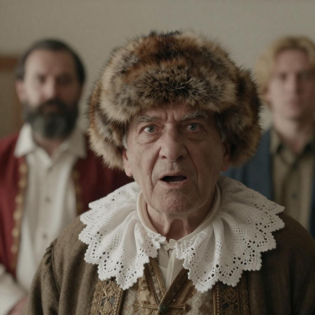 Old man in fur hat and robe with white lace collar, intense expression, mouth open, blurred background. Two people behind, one bearded in red and white, other blonde, both out of focus. Warm indoor setting.