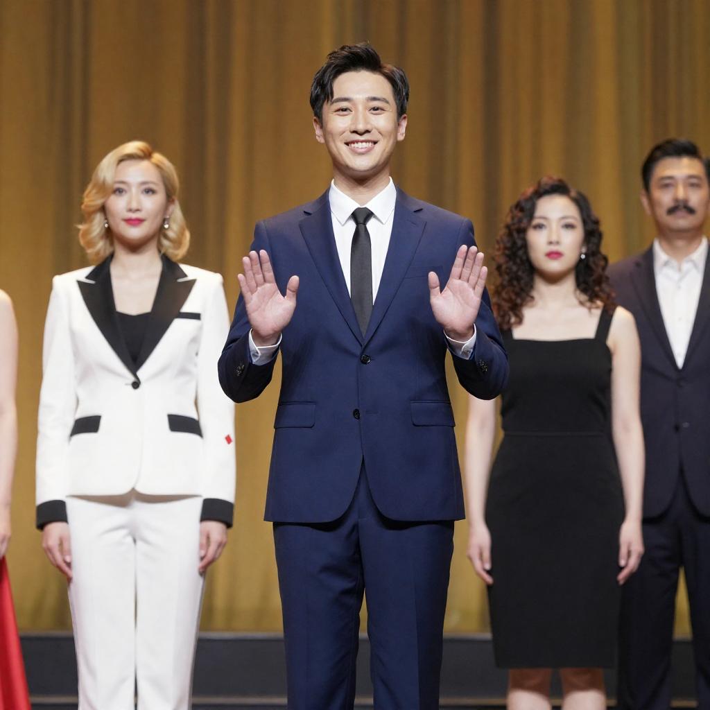 Photograph of four people on stage. Three women in orange, sleeveless, pleated dresses with pink flowers, standing in a row. One man in a brown button-up shirt, standing between two women. Dark background with stage lights. All four have curly black hair. Women's dresses flow to the ground. Man's shirt is slightly unbuttoned. Women's expressions are neutral, man's expression is serious.