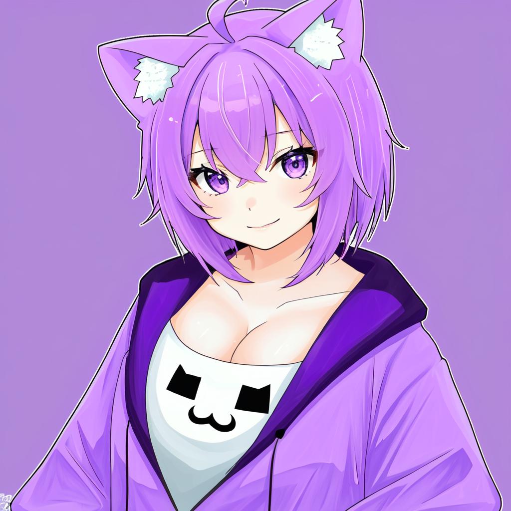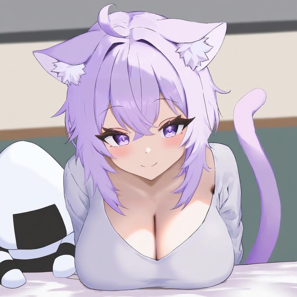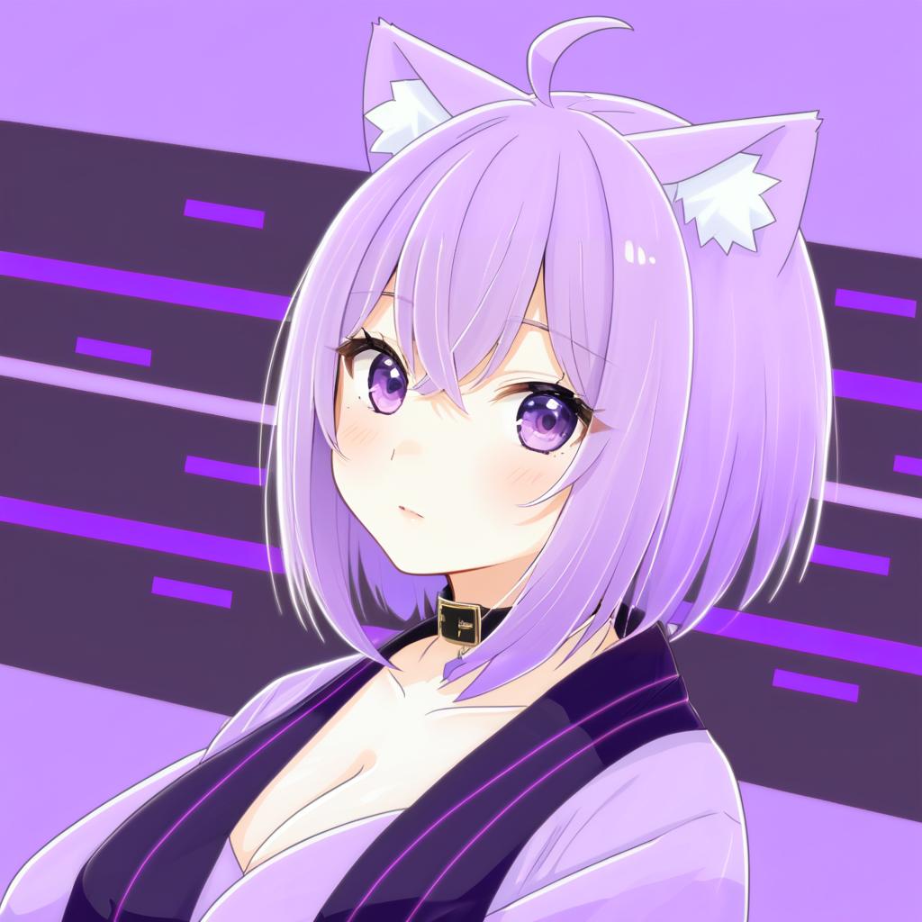 Onigirya (nekomata okayu), hololive, 1girl, cat girl, cat ears, animal ear fluff, cat tail, purple eyes, hair between eyes, purple hair, short hair, medium hair, ahoge, crossed bangs, large breasts, cleavage, long sleeves, virtual youtuber, virtual youtuber, by artist ino (magloid), anime