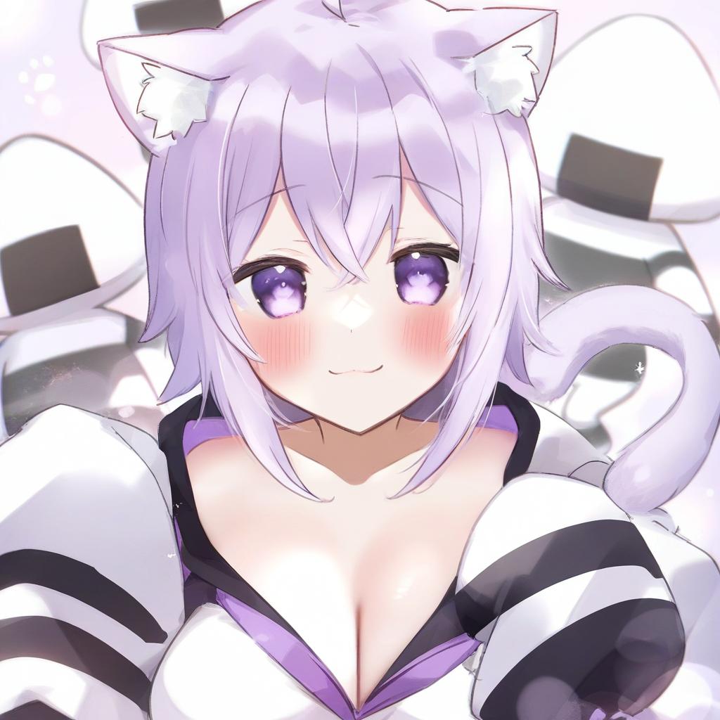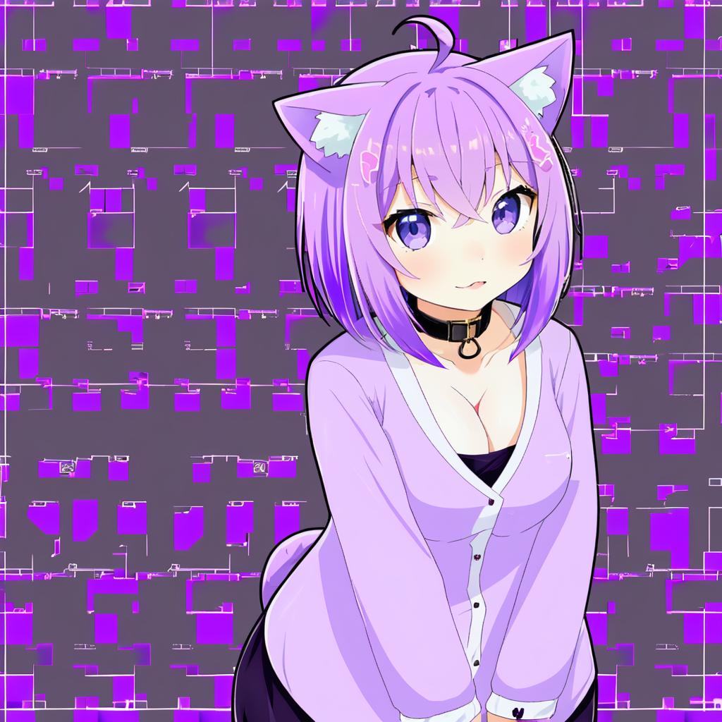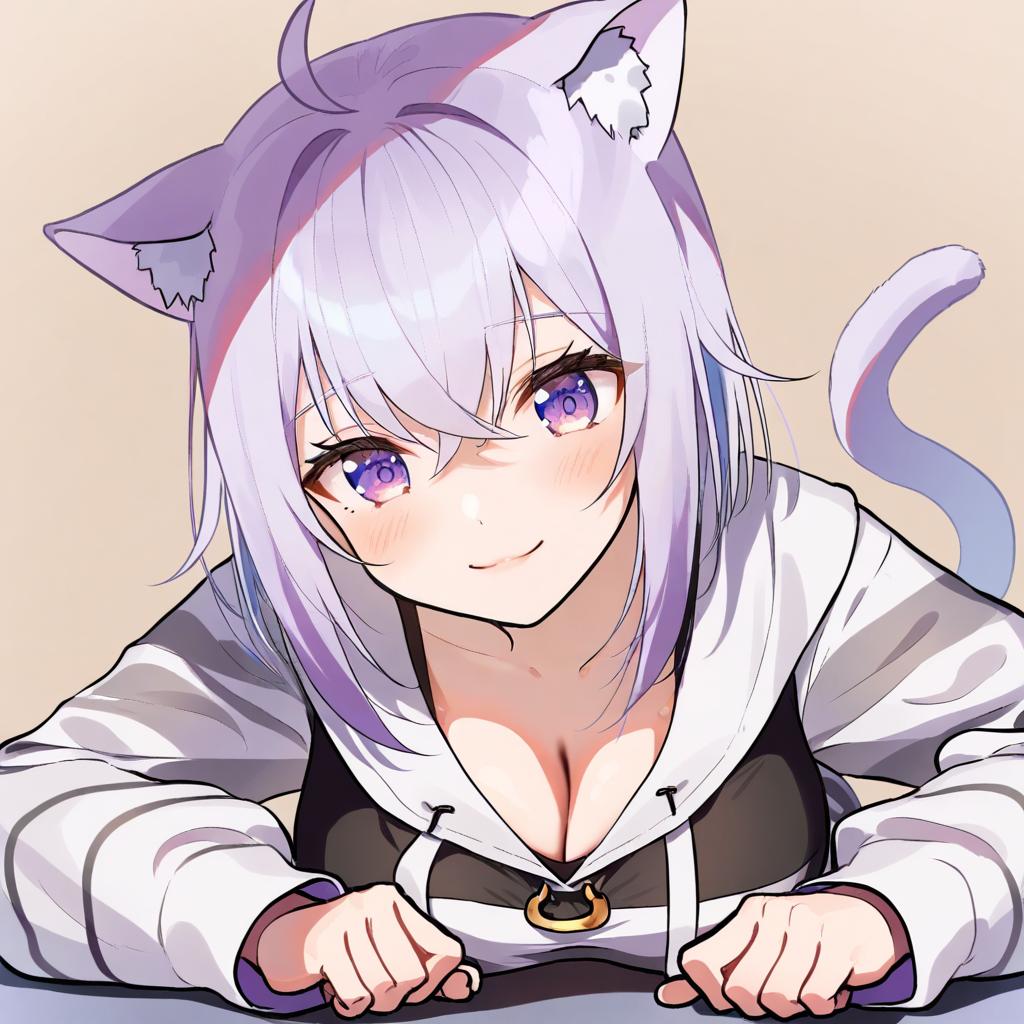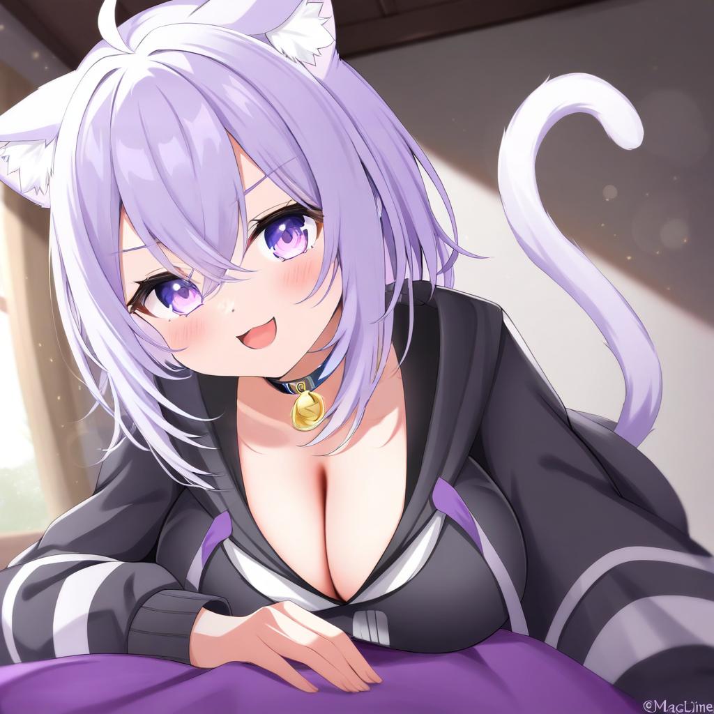 Onigirya (nekomata okayu), hololive, 1girl, cat girl, cat ears, animal ear fluff, cat tail, purple eyes, hair between eyes, purple hair, short hair, medium hair, ahoge, crossed bangs, large breasts, cleavage, long sleeves, virtual youtuber, virtual youtuber, by artist ino (magloid), anime