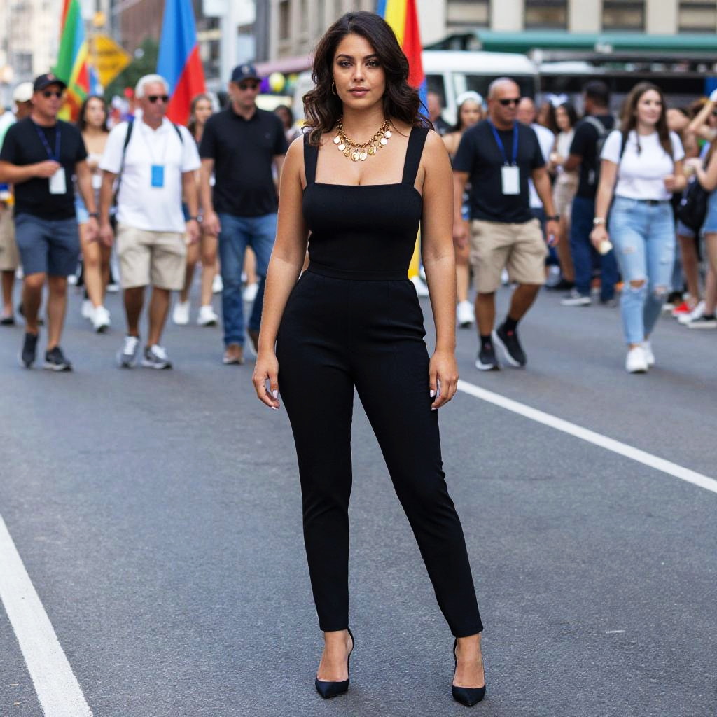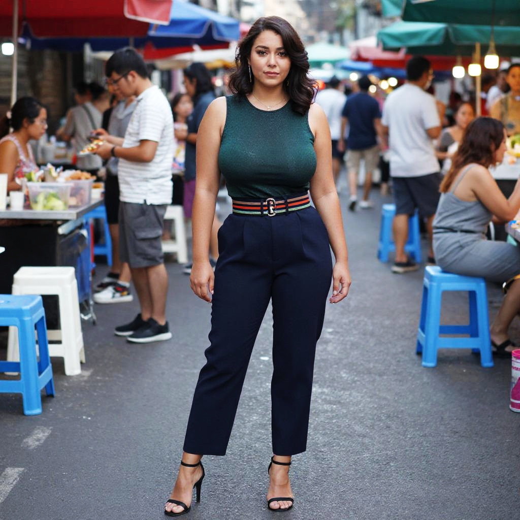 A stocky woman in casual chic attire, wearing navy high-waisted trousers with a multicolored striped belt and a sleeveless dark green top with a subtle sheen, stands in a vibrant Bangkok street food market, embodying the visual style of Gottfried Helnwein. She completes her look with open-toe black heeled sandals. Sexy. Pretty face and beаutiful eyes. Big breasts