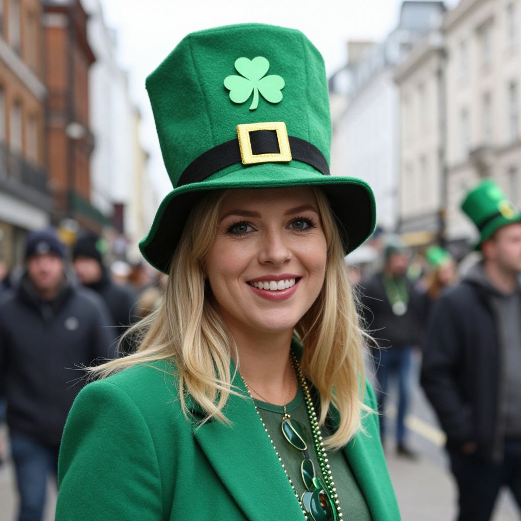 Blonde-haired woman donning a vibrant green leprechaun hat adorned with a shamrock pin and matching green attire, smiling warmly amidst the bustling streets of London during St Patrick's Day celebrations.
