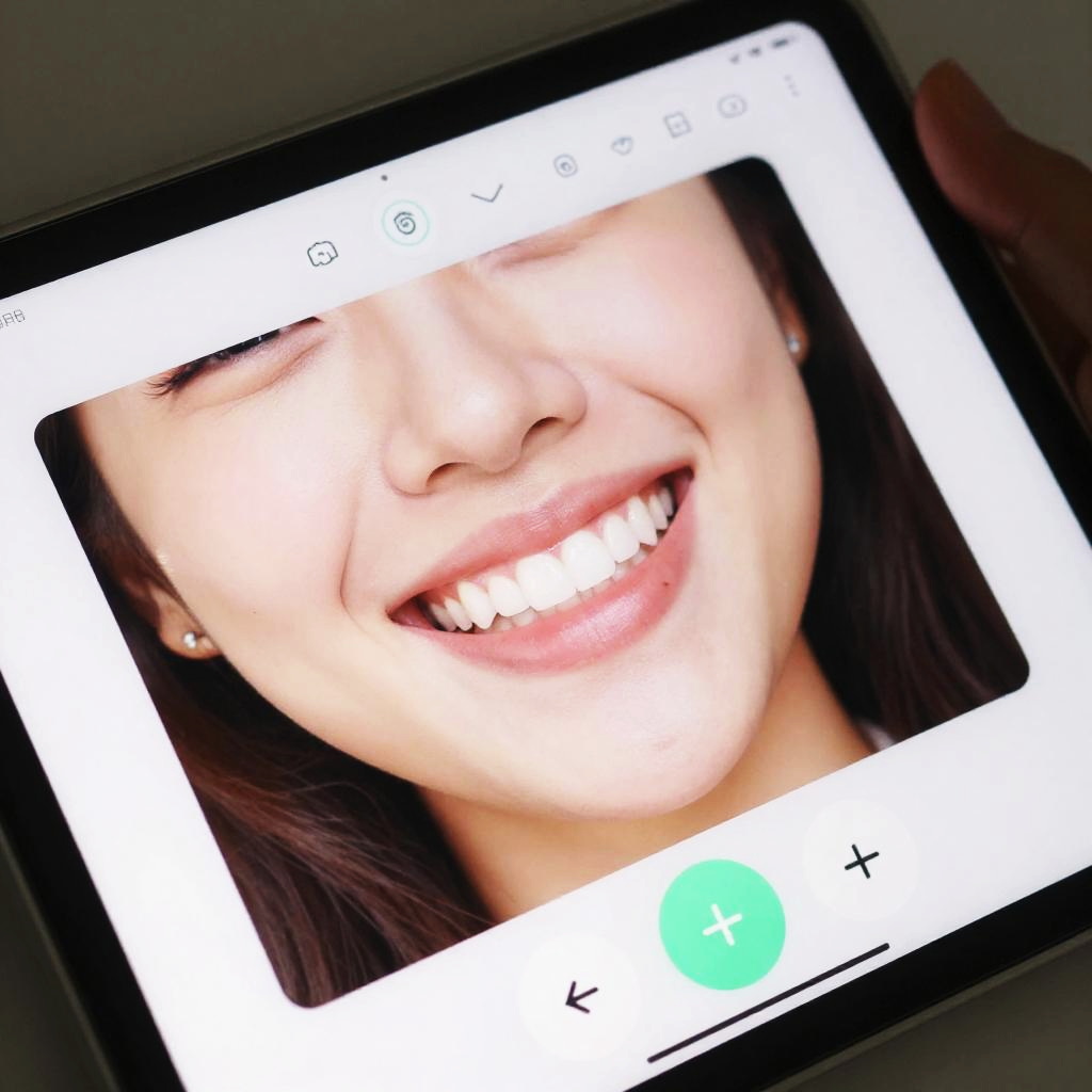 Close-up scene of a person using a photo smile editor online free on a tablet, vivid smile corrections with smooth, seamless teeth whitening and expression boosts, lively colors and intuitive buttons in the user interface, tech-savvy environment highlighting ease of free smile editing.
