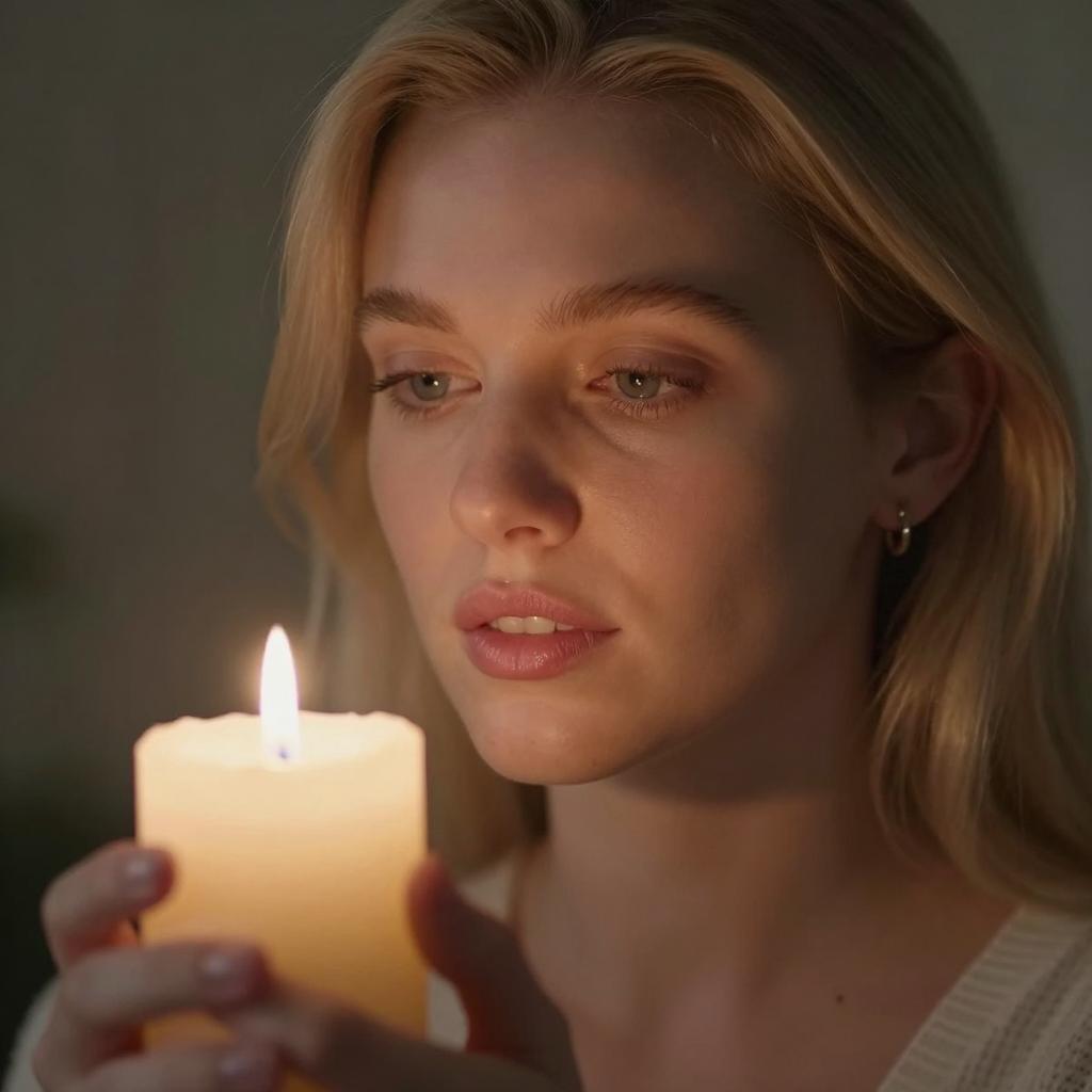 Close-up photograph of a blonde woman with light skin, holding a lit candle in her right hand. Her lips are slightly parted, showing a focused expression. Dark background, soft candlelight illuminates her face. She wears small earrings.