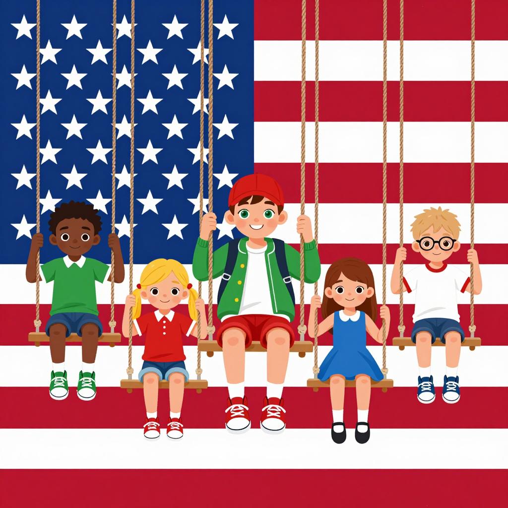 Digital illustration of six children swinging from ropes on a large American flag background. Children have varied expressions: smiling, neutral, and focused. Lead child in green jacket and red cap in center. Other children: black boy in green shirt, blonde girl with pigtails, bespectacled bald boy, brown-haired girl in blue dress, and blonde boy in white shirt. Red, white, and blue flag stripes form backdrop.