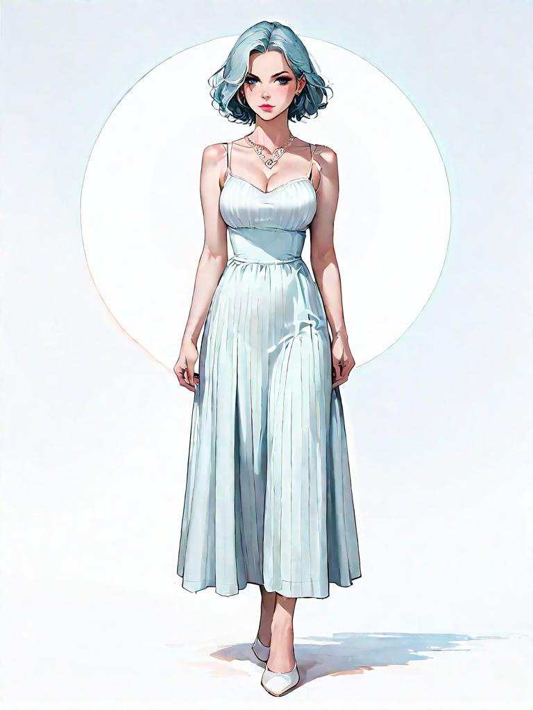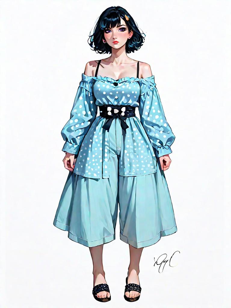 1girl, source_comics, realistic face, full body shot, Woman, contemporary, off-the-shoulder blue top with white polka dots, three-quarter sleeves with bow tie detail, paired with high-waisted yellow flared trousers with a slight ruffle at the hem, black open-toe mule sandals, plain white background.