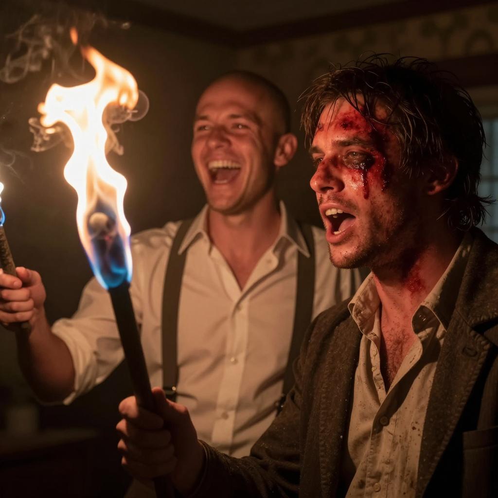 Man and woman in dimly lit cave. Man, in brown suit and tie, holds paper, crouches on left. Woman, with blonde hair, in plaid shirt, holds lit torch, sits on right. Firelight casts warm glow. Rock formations in background. Man looks at woman, woman looks at torch. Both focused on each other.