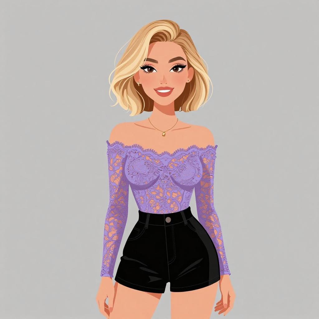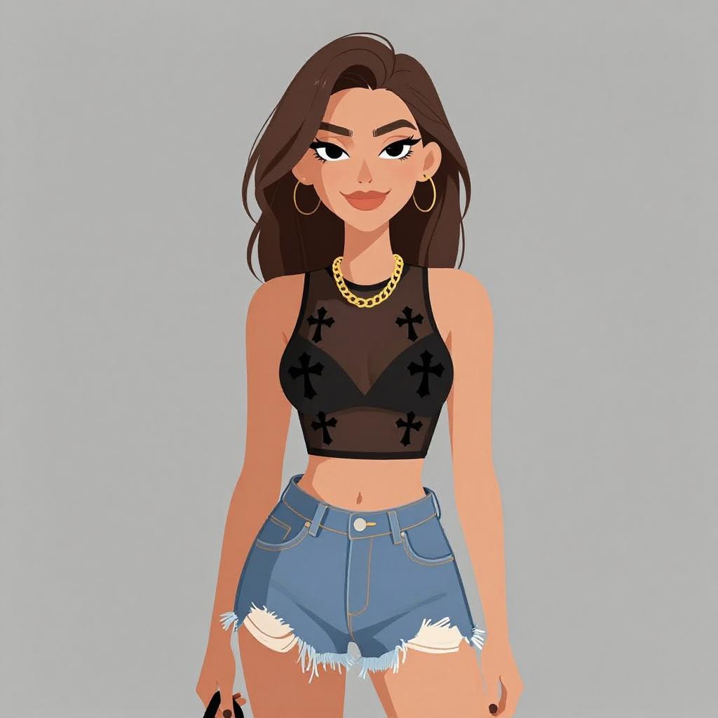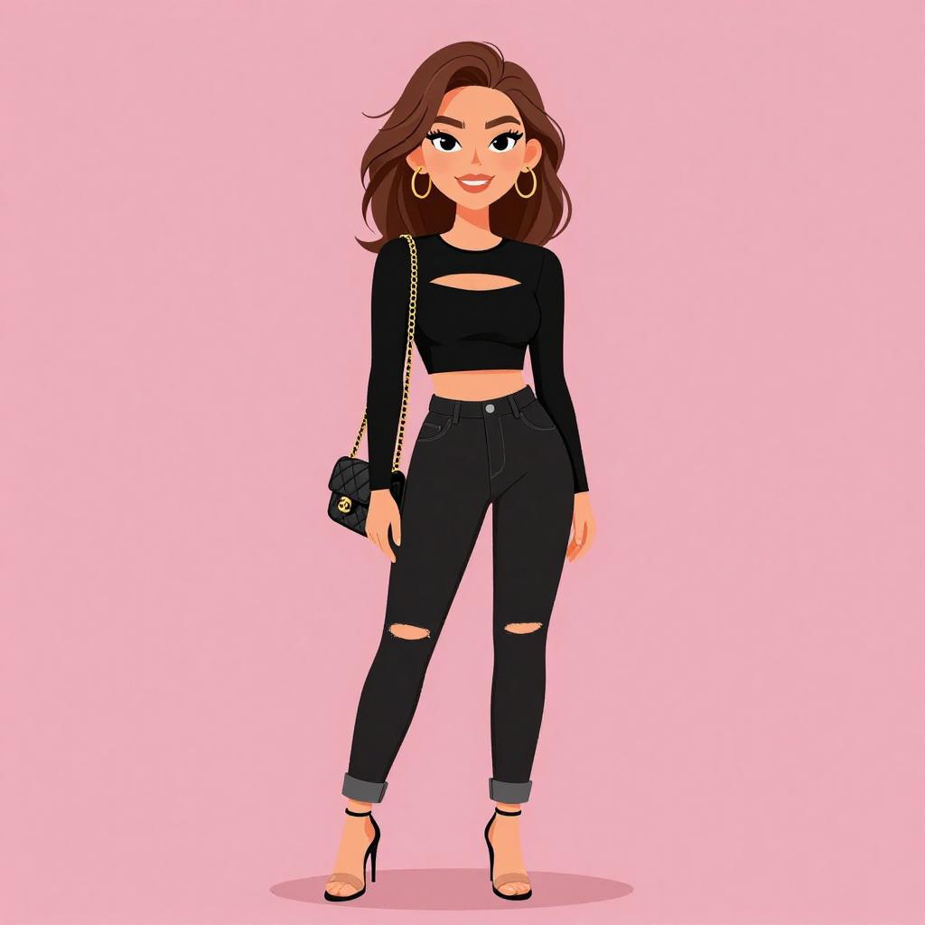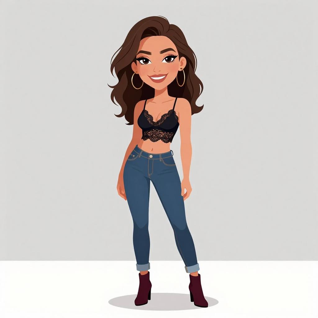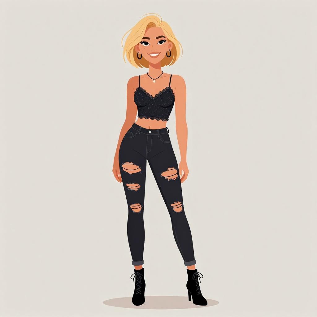 Woman with pretty face and pretty hair. smiling Woman, grunge style, distressed black jeans with multiple horizontal slits, dark camisole with lace trim and subtle pattern, thin spaghetti straps, black lace-up ankle boots with heels, minimal jewelry with thin necklace and hoop earrings, messy short blonde hair, neutral studio background. --sref 1467