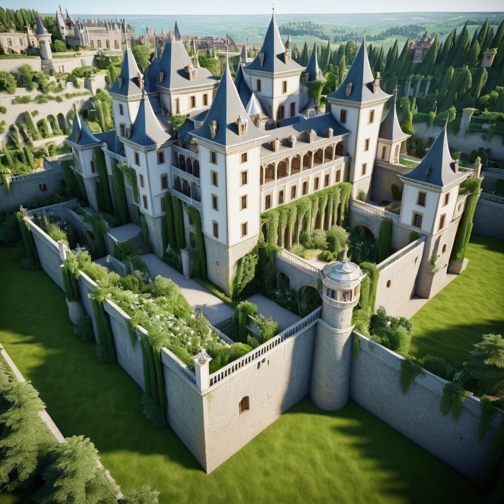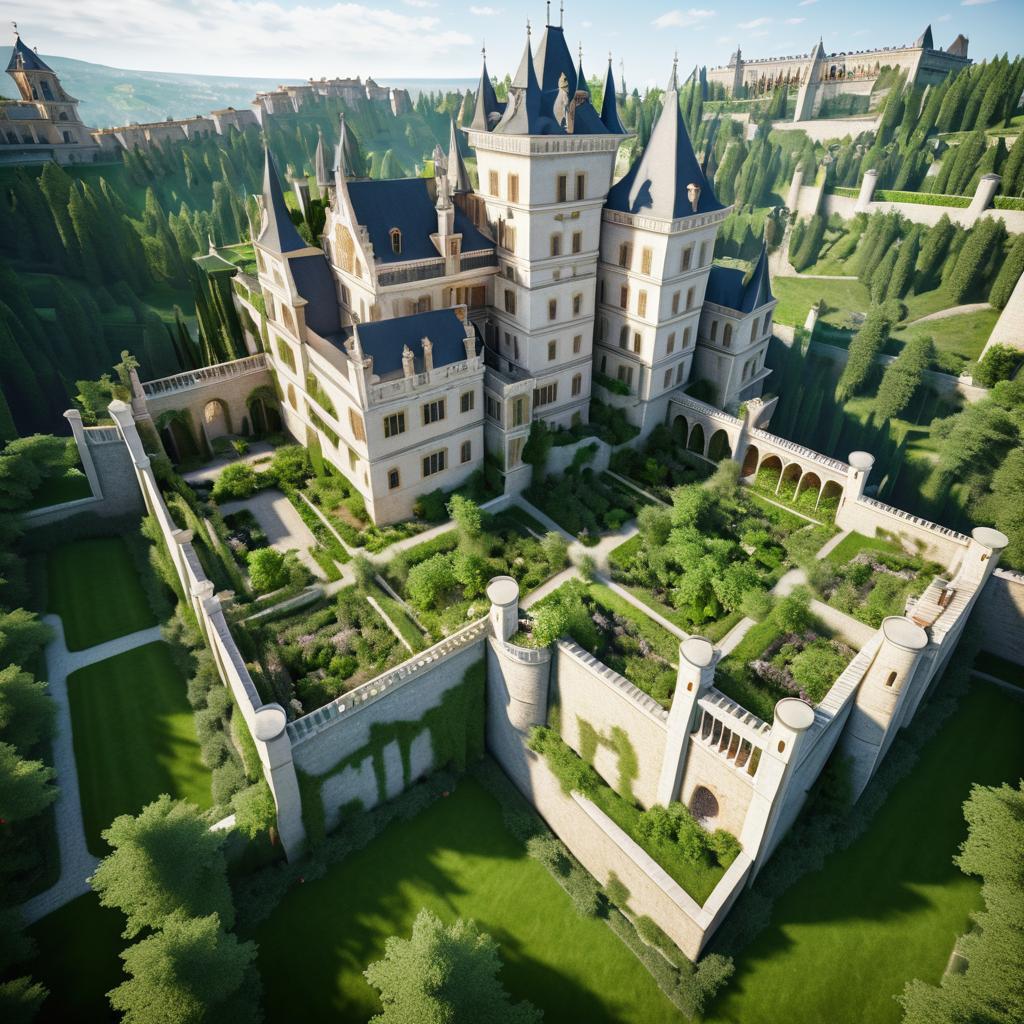 High-definition HDR wide-angle bird's-eye view of a grand historical castle featuring multiple towers with steep roofs and terraced stone walls filled with lush green plants. The castle is surrounded by manicured gardens and pathways, capturing natural lighting and detailed architectural design in a realistic 3D rendering style.