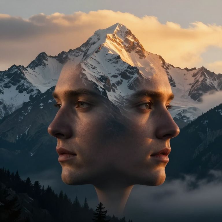 Brokeback Mountain face swap: A surreal, high-resolution image of two mountain faces merged in a dramatic face swap, set against the rugged, snow-capped peaks of Brokeback Mountain. The blend of features creates a hauntingly beautiful and otherworldly expression, glowing under a golden hour sky with misty clouds. Cinematic lighting, detailed textures, photorealistic style, MidJourney aesthetic.