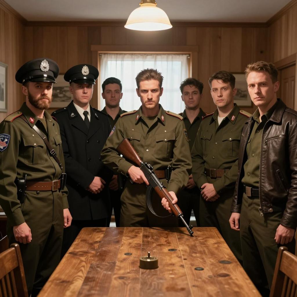 Photograph of a wooden room. A uniformed Nazi officer with a peaked cap, blonde hair, and a stern expression stands between two shirtless men. One man has blond hair, the other dark hair. The officer faces the men, who look at him. Sunlight filters through a window, casting shadows. Clothes hang in the background. Three people visible.