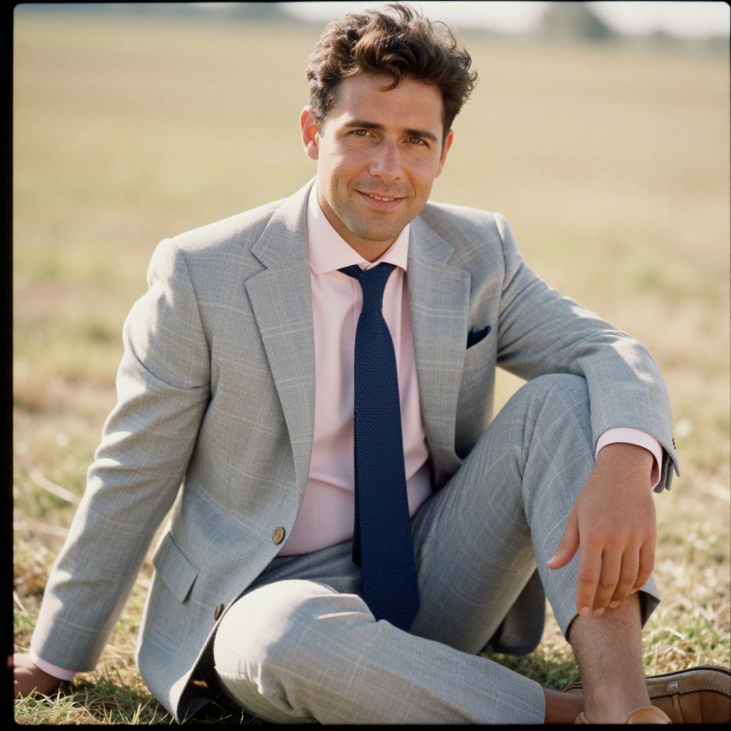 A man, light gray windowpane suit, pale pink dress shirt, textured navy tie, tan leather loafers, sun-drenched field, lomography analog photo, relaxed smile, warm sunlight illuminating his features. Man has masculine face and piercing eyes