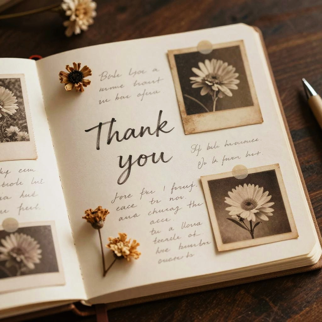 Photograph of a handwritten thank-you note in an open notebook with black-and-white daisy photos, small dried flowers, and a pen on a wooden