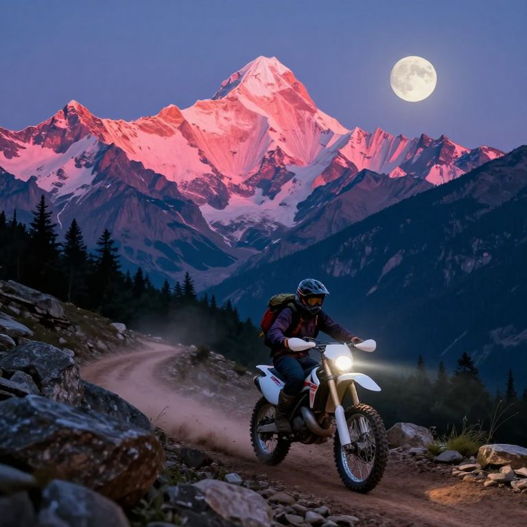 The image depicts a vibrant, 80s-style, retro-futuristic landscape with a striking alpenglow effect on the mountain peaks, casting a warm, pinkish hue over the snow-capped peaks. The scene is illuminated by a full moon, adding a cinematic quality to the atmosphere. A person is riding a dirtbike, equipped with a backpack, navigating a rugged trail that winds through the rocky terrain. The dirtbike's headlights cast a bright glow, contrasting with the dark, shadowy forest in the background. The overall composition is highly detailed and photorealistic, reminiscent of Studio Ghibli art style, with a surreal, dreamlike quality. The spatial relationships are dynamic, with the dirtbike positioned in the foreground, the mountain peaks towering in the background, and the moon hanging in the sky, creating a sense of depth and scale. The interplay of colors, textures, and shapes enhances the visual richness of the scene, making it a captivating and immersive experience.